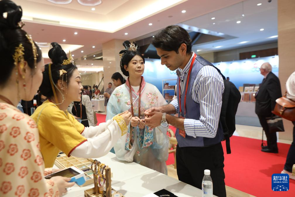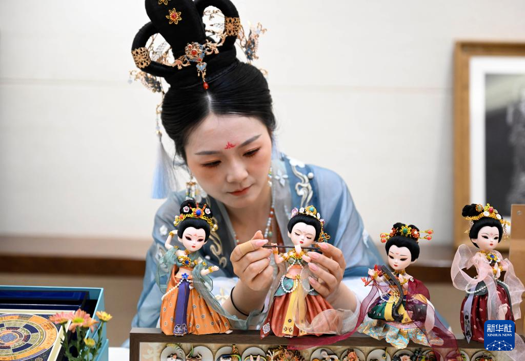 5月30日,一名古装女子在第四届文明交流互鉴对话会的开幕式后整理敦煌文化主题展品。
