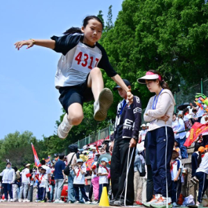5月30日,青岛市实验小学学生参加跳远比赛。