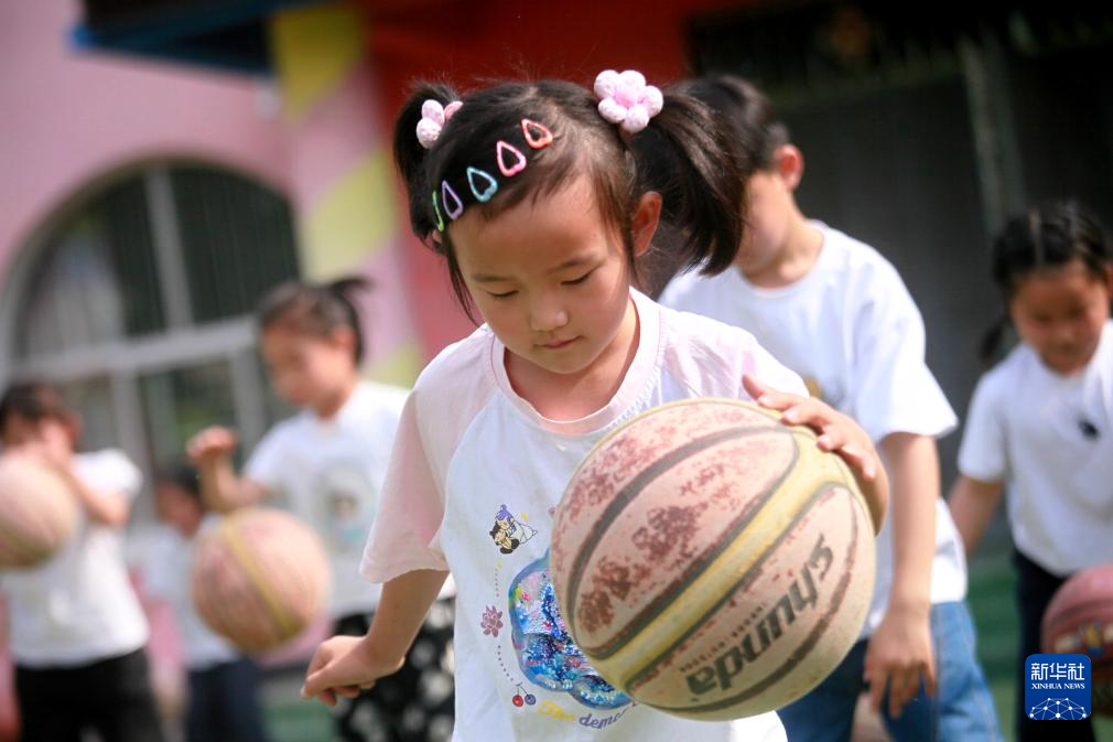 5月30日,山东省临沂市平邑县卞桥镇中心幼儿园的小朋友在进行拍球趣味游戏。