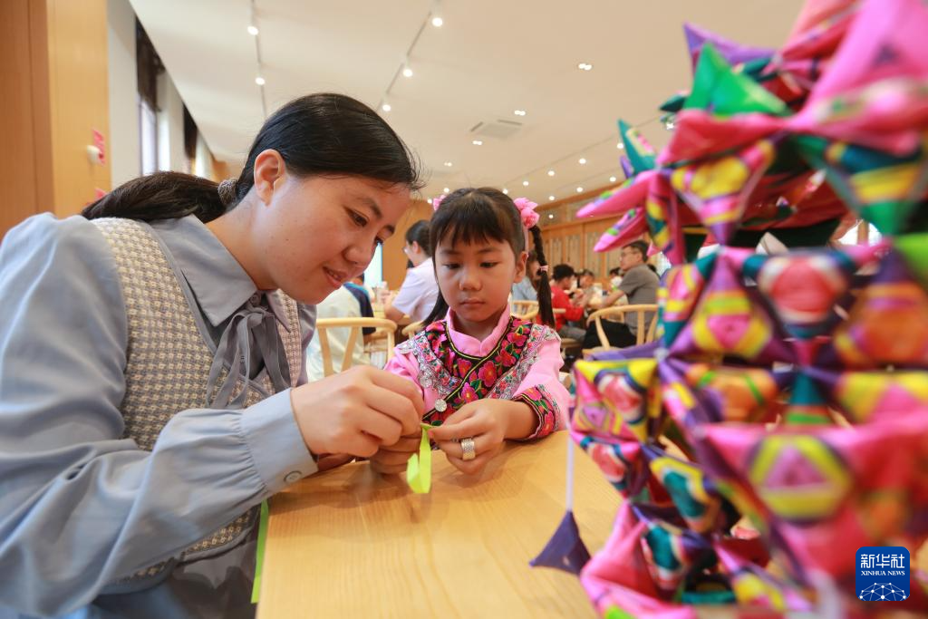 5月31日,在位于云南省蒙自市的红河书院,家长和孩子一起体验草编菱角。