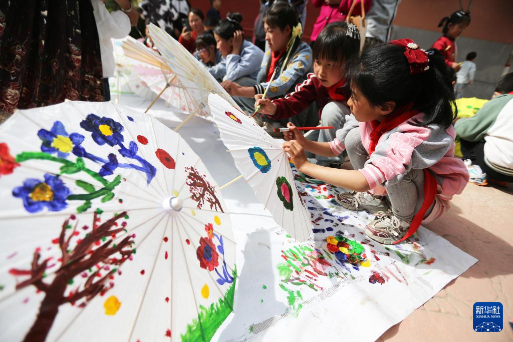 5月31日,学生在甘肃省定西市美术馆进行创意绘画。