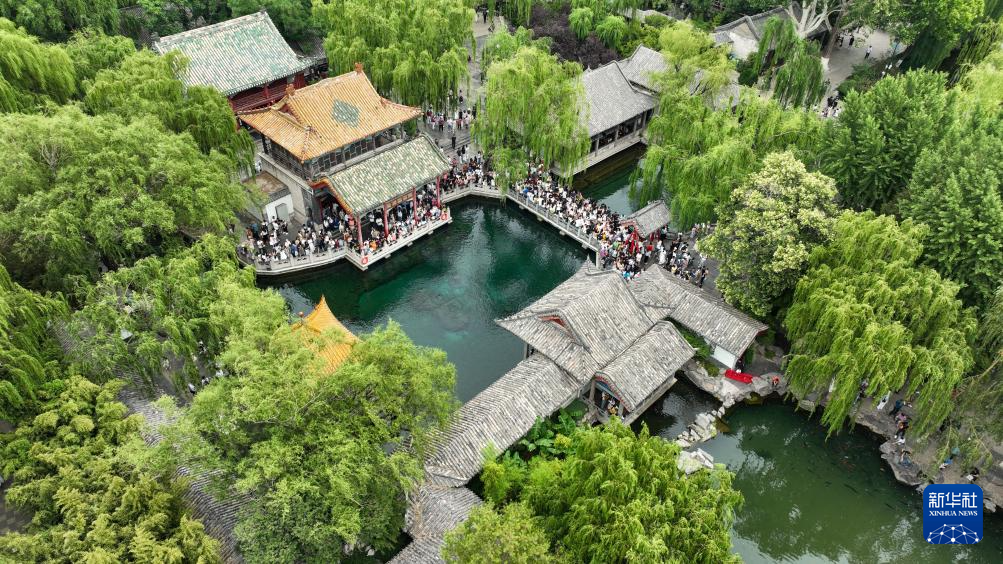 5月31日,游客在山东省济南市趵突泉公园赏泉游玩(无人机照片)。
