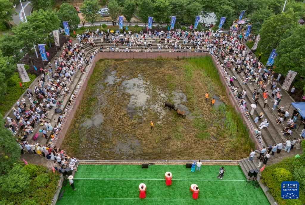 5月31日,浙江省金华市婺城区雅畈镇汉灶村斗牛场上演端午节斗牛(无人机照片)。