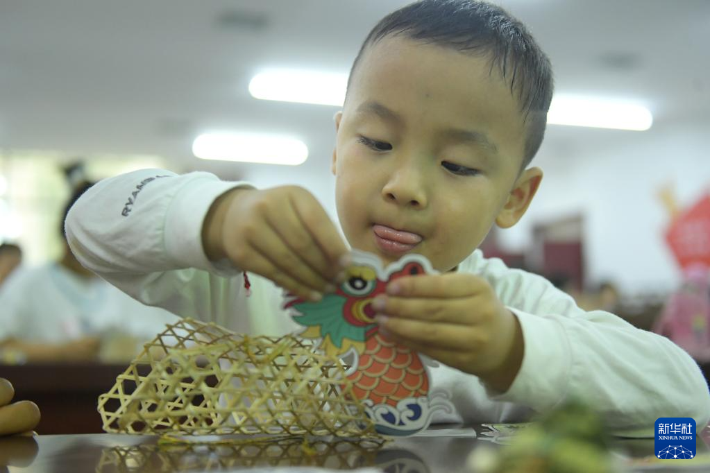 5月31日,在河南省商丘市夏邑县文化馆,小学生参加手工龙舟制作活动。