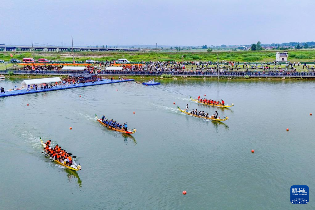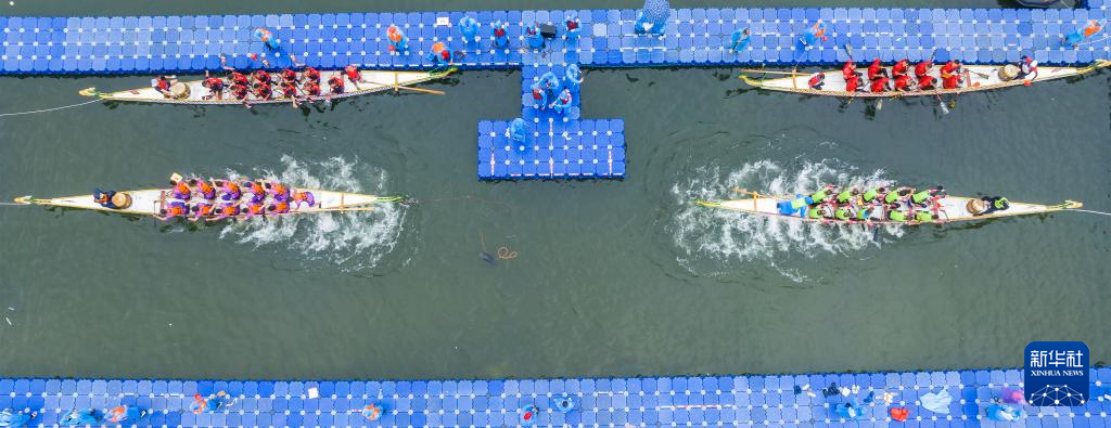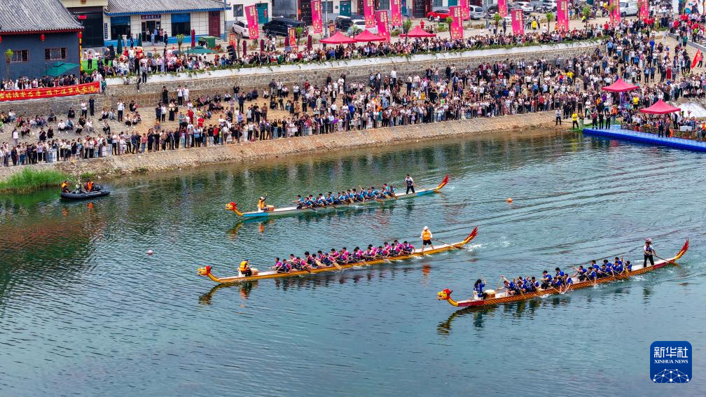 5月31日,在河南省洛阳市嵩县黄庄乡,龙舟队在水面竞逐(无人机照片)。
