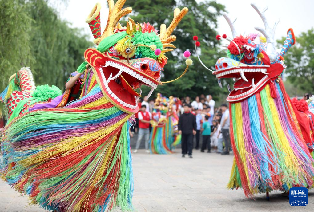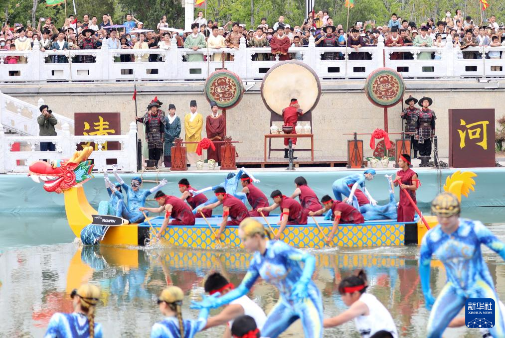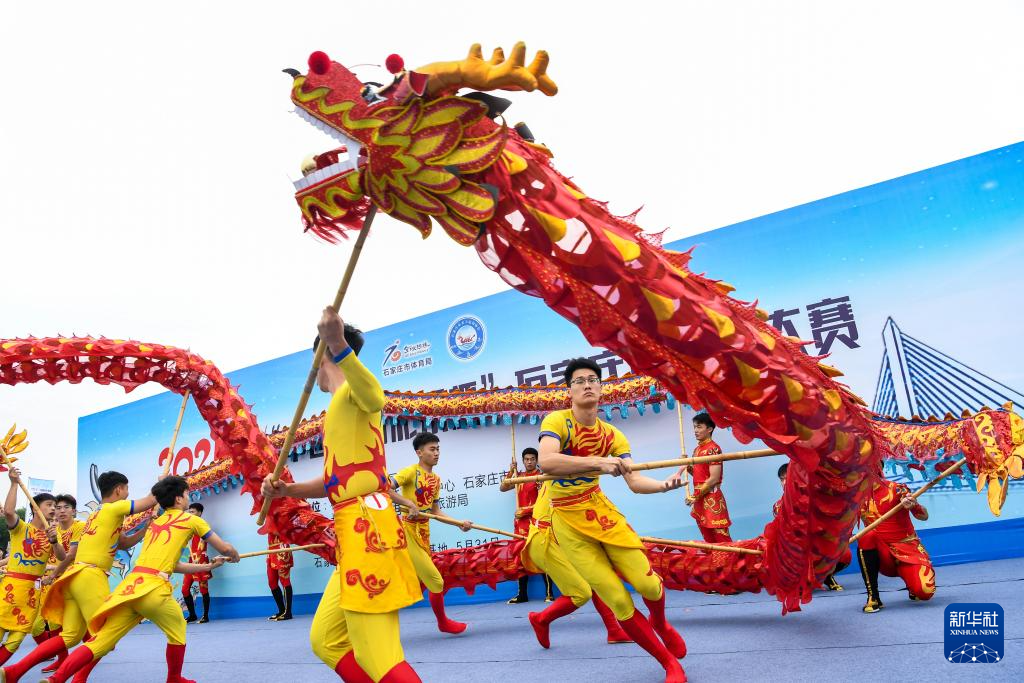 5月31日,在河北省石家庄太平河水上训练基地,人们舞起长龙。