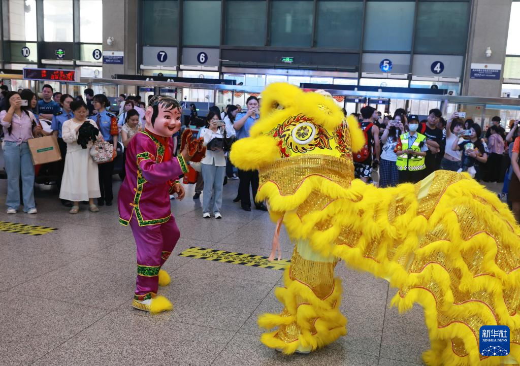 5月31日,在湖北省武昌站,民间艺人为旅客表演舞狮。