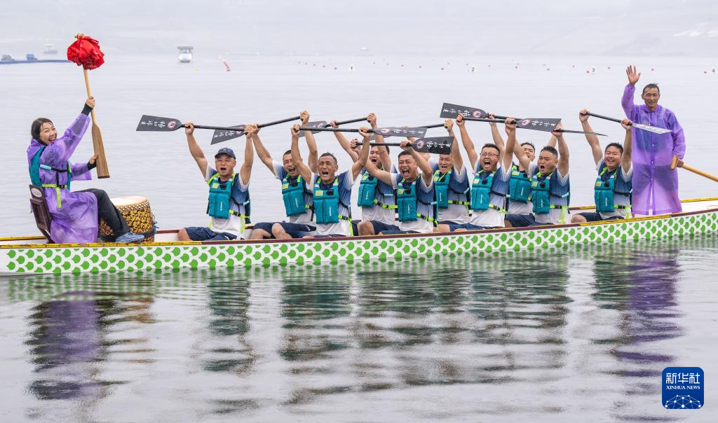5月31日,湖北省宜昌市秭归县归州镇龙舟代表队“抢红夺标”后欢庆胜利。