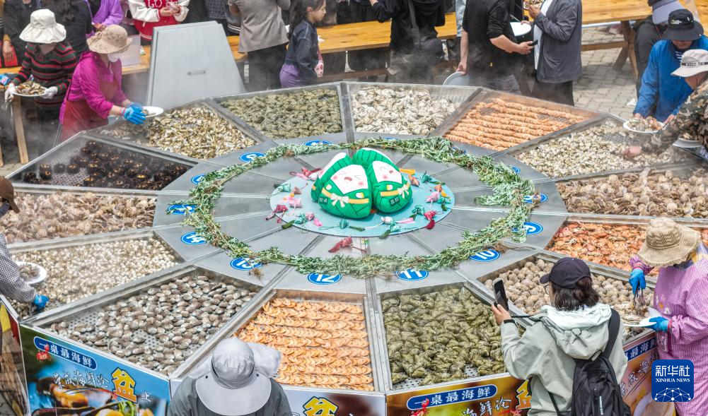 5月31日,山东省荣成市成山头风景区,游客在品尝端午节海鲜大锅宴(无人机照片)。