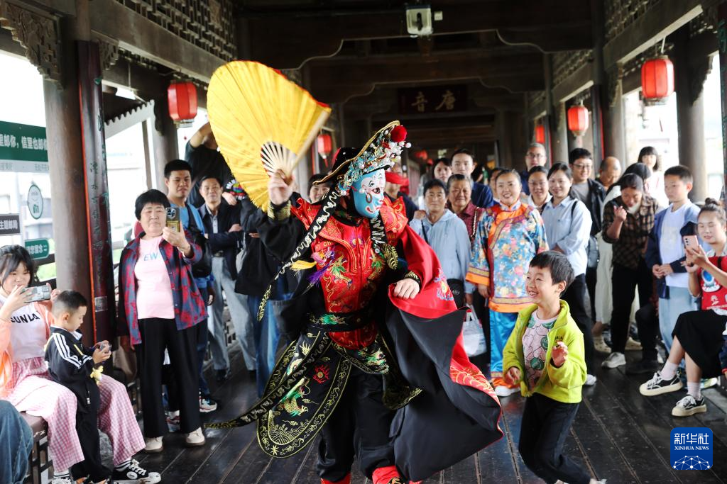 5月31日,重庆市黔江区濯水古镇景区工作人员在风雨廊桥上表演川剧变脸。