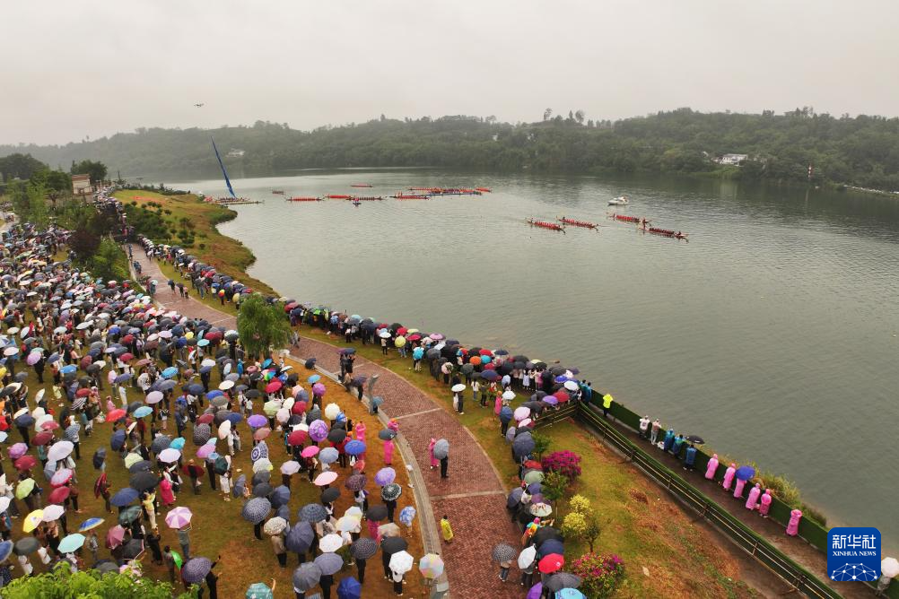 5月31日,龙舟在四川省广安市武胜县嘉陵江龙女湖水域竞渡(无人机照片)。