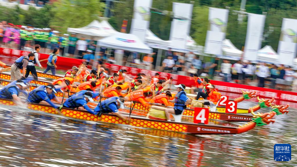 5月31日,在河北省石家庄市太平河水上训练基地,参赛队伍进行龙舟比赛(无人机照片)。