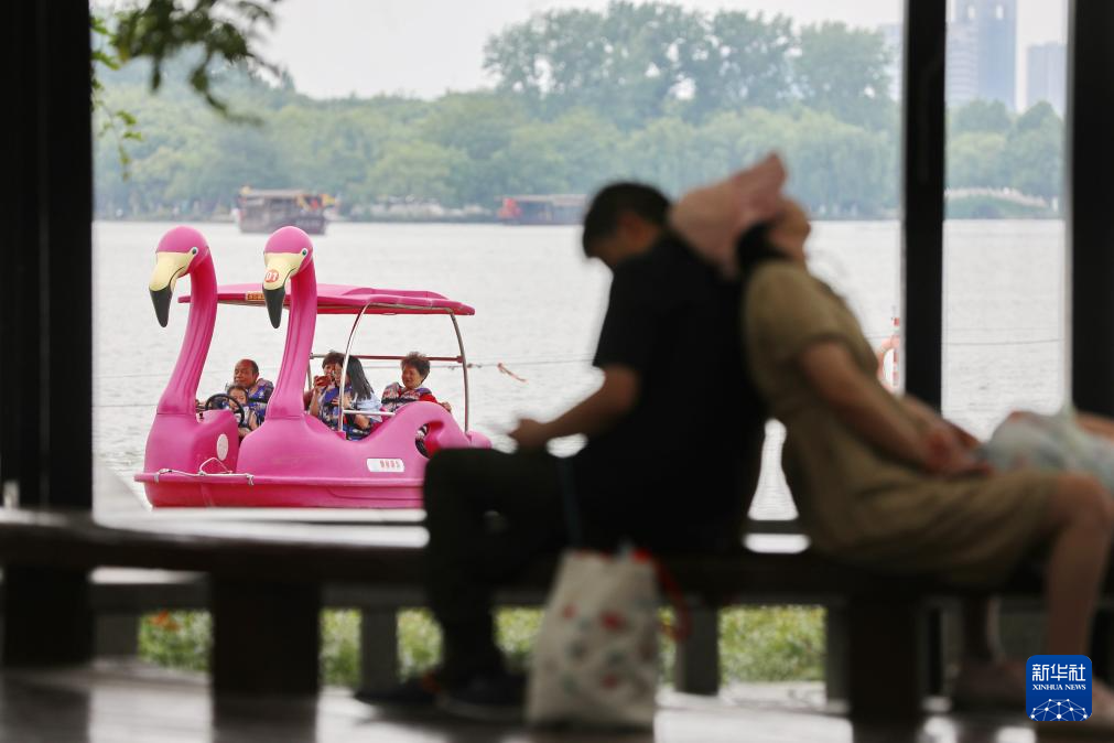 5月31日,游客(后)在浙江省嘉兴市南湖景区乘坐游船休闲游玩。