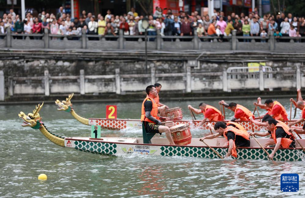 5月31日,龙舟选手在贵州省都匀市剑江河上竞渡。