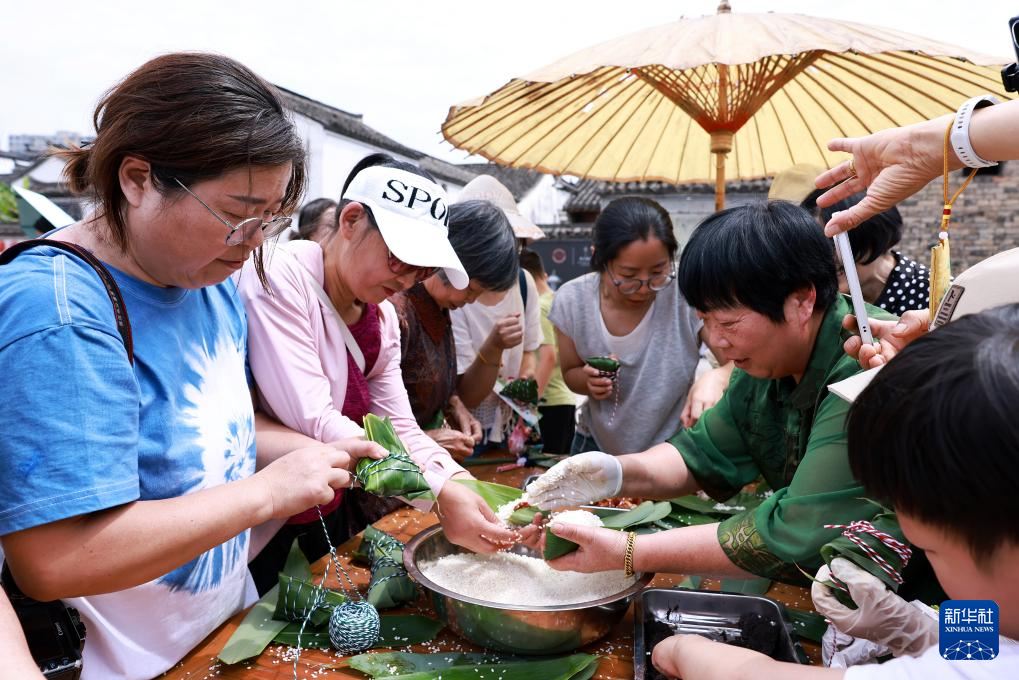 5月31日,在浙江省东阳市卢宅景区梨园广场,人们参加包粽子大赛。