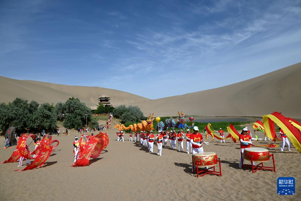 5月31日,一支舞龙队在甘肃省敦煌市鸣沙山月牙泉景区为游客表演舞龙。