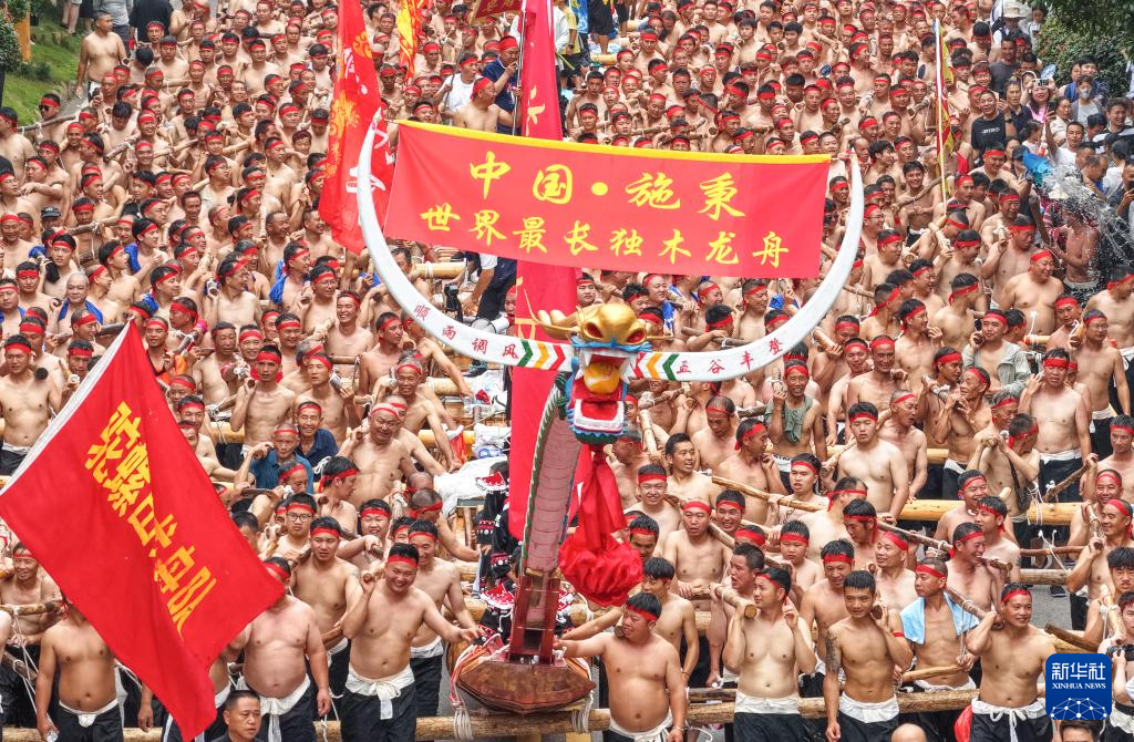 5月31日,在贵州省施秉县举行的独木龙舟节上,人们抬着独木龙舟进行巡游活动(无人机照片)。