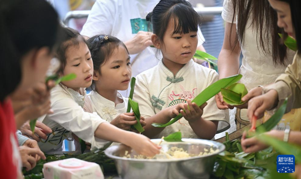 5月31日,在四川省泸州市青少年服务中心,孩子们在学习包粽子。