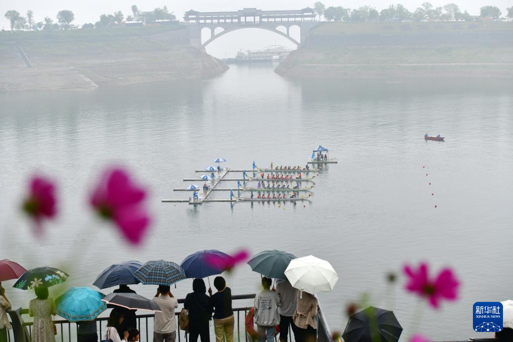 5月31日,人们冒雨在三峡坝前的湖北省宜昌市秭归县徐家冲港湾水域观看2025屈原故里传统龙舟大赛。