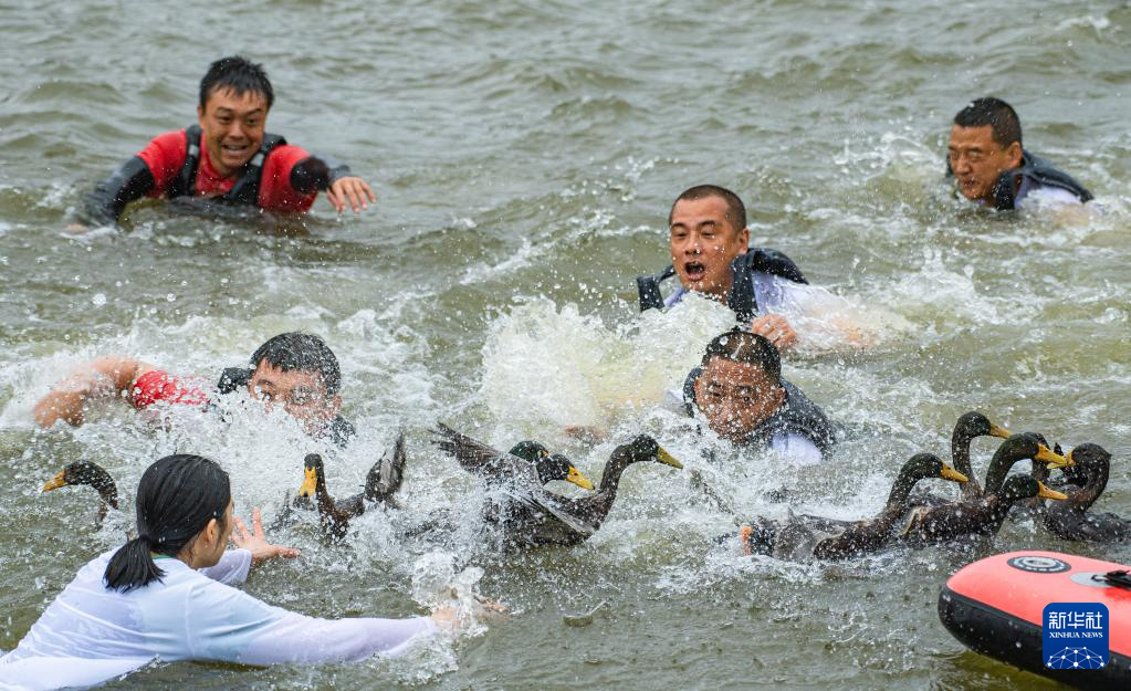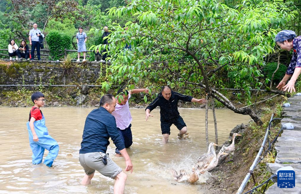 5月31日,游客在重庆市酉阳土家族苗族自治县桃花源景区参与“捉鸭子”趣味游戏。
