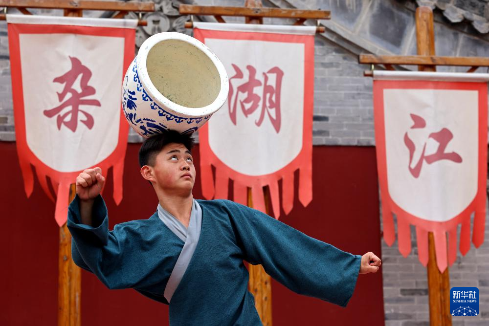 5月31日,民间艺人在京杭大运河畔的山东省枣庄市台儿庄古城为游客表演顶缸。