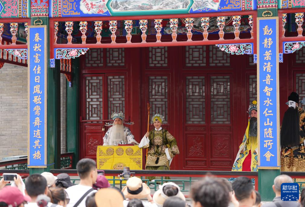5月31日,游客在沈阳故宫欣赏评剧《杨八姐游春》演出。