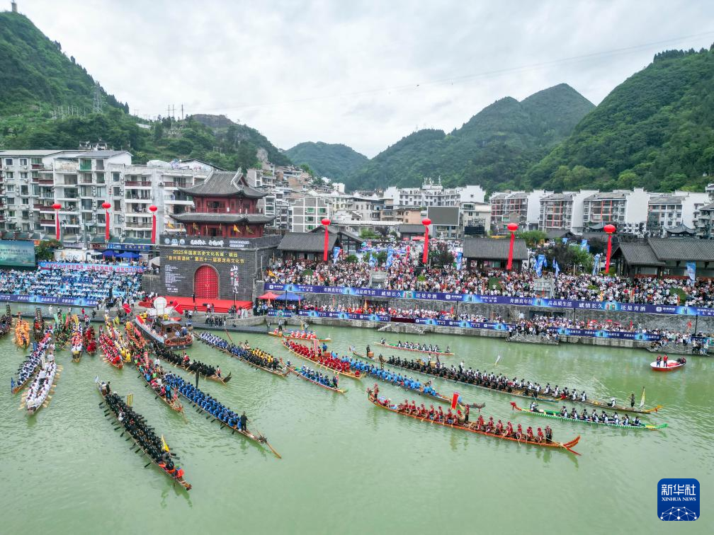5月31日,龙舟队伍在贵州省黔东南苗族侗族自治州镇远县㵲阳河上集结(无人机照片)。