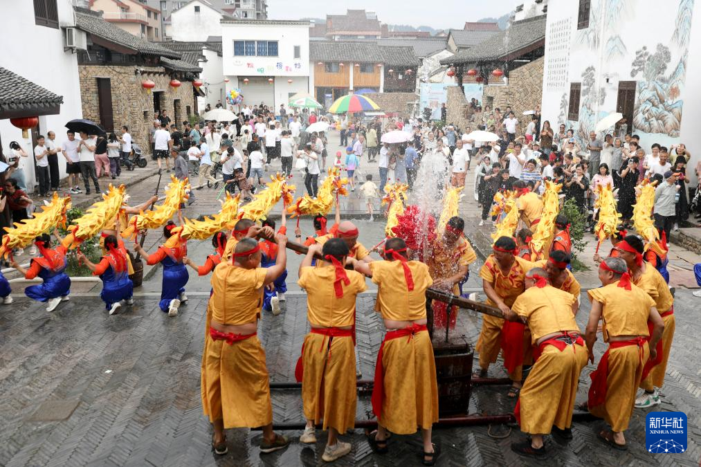 5月31日,浙江省杭州市桐庐县凤川街道翙岗古村村民为游客表演“射洋龙”。