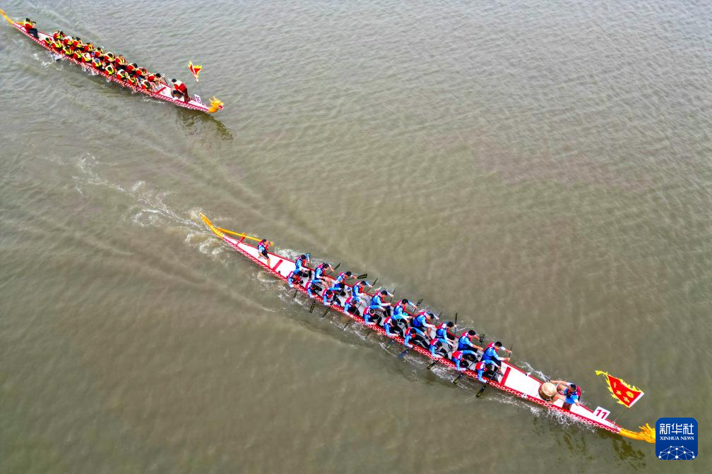 5月31日,在松花江哈尔滨道里区段,参赛队伍在进行龙舟比赛(无人机照片)。