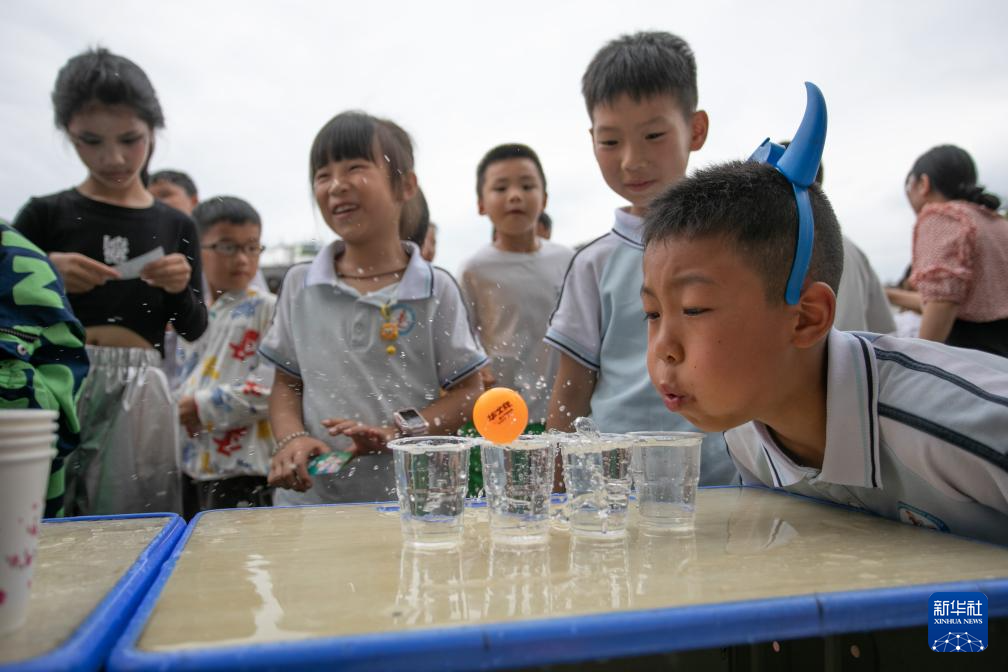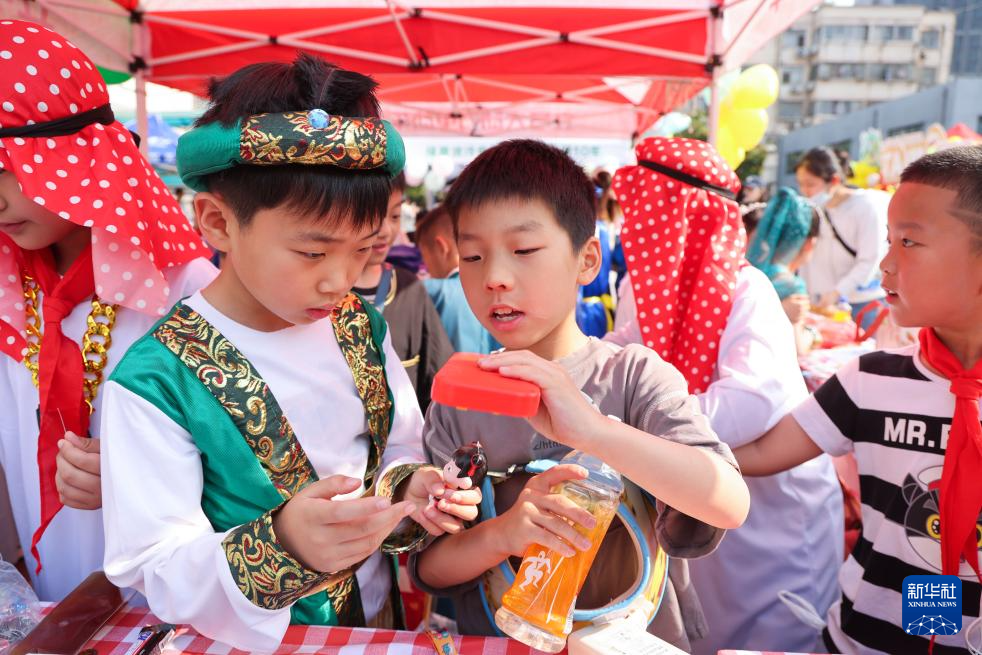 5月30日,在重庆市秀山土家族苗族自治县民族小学校园集市,学生们参加趣味游戏。