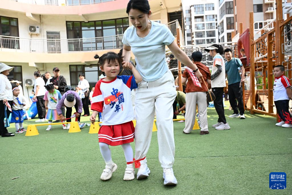 5月30日,山东省烟台市福山区实验幼儿园的小朋友和家长玩亲子游戏。