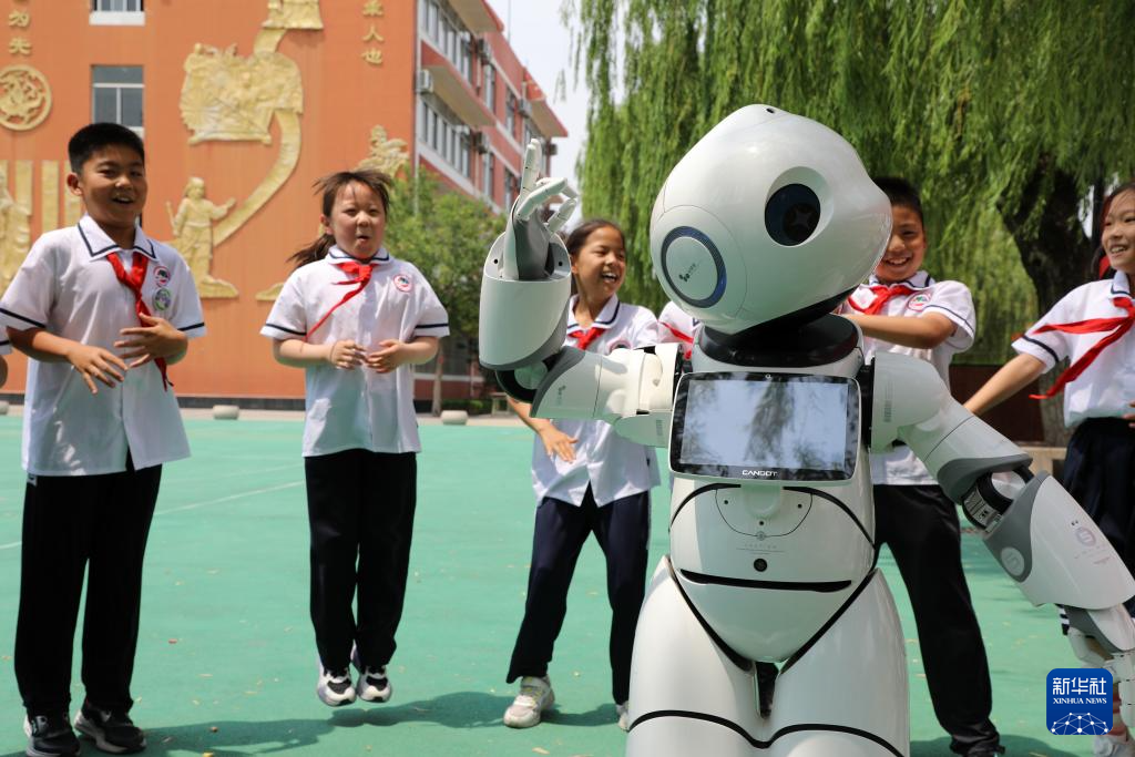 5月30日,在山东省滨州市博兴县第一小学“‘星穹启智 科技领航’——科技嘉年华”活动上,小学生在和一款智能机器人互动。