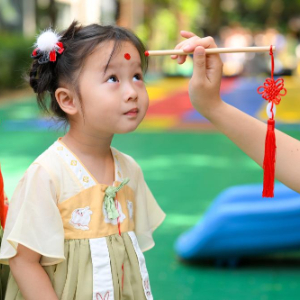 5月30日,江苏南京建邺区金地名京幼儿园的老师为小朋友点朱砂。