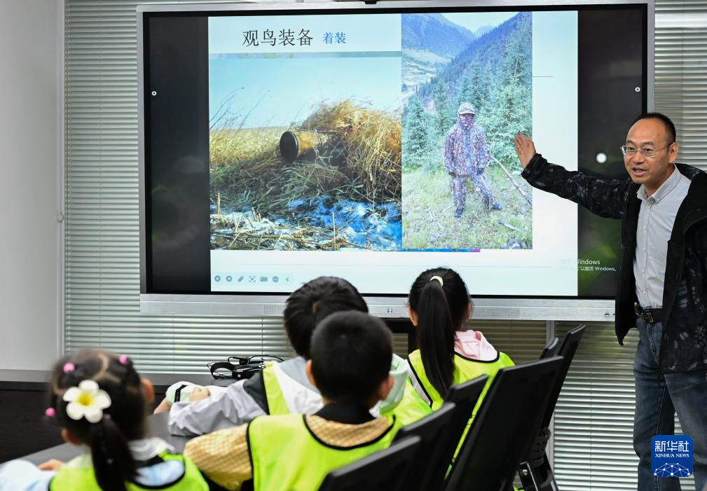 5月31日,青海师范大学陈振宁教授在青海省自然资源博物馆为小朋友们讲解观鸟知识。