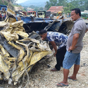5月31日,在印度尼西亚西爪哇省井里汶,人们在事发采石场附近查看受损车辆。
