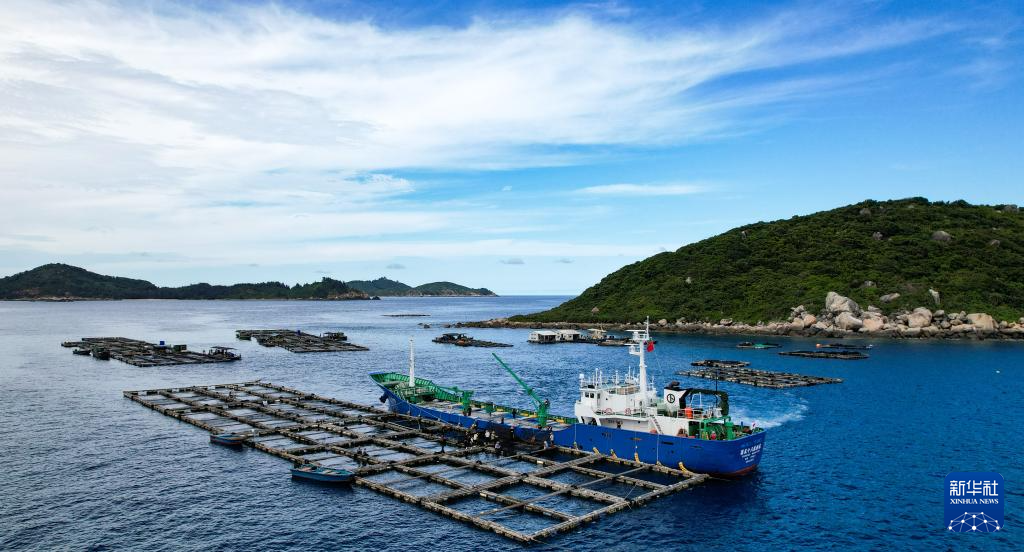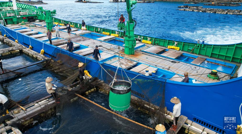日本籍渔船在海南省万宁市附近海域装运章雄鱼苗(5月15日摄,无人机照片)。