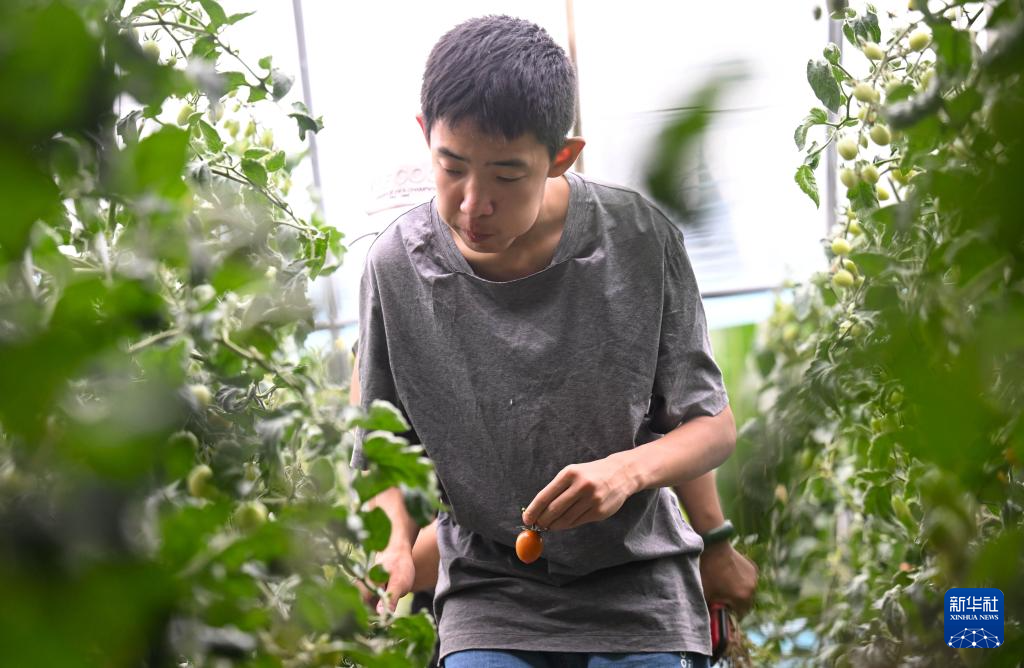 孩子在天津市西青区杨柳青镇的汇爱农庄采摘西红柿(5月31日摄)。