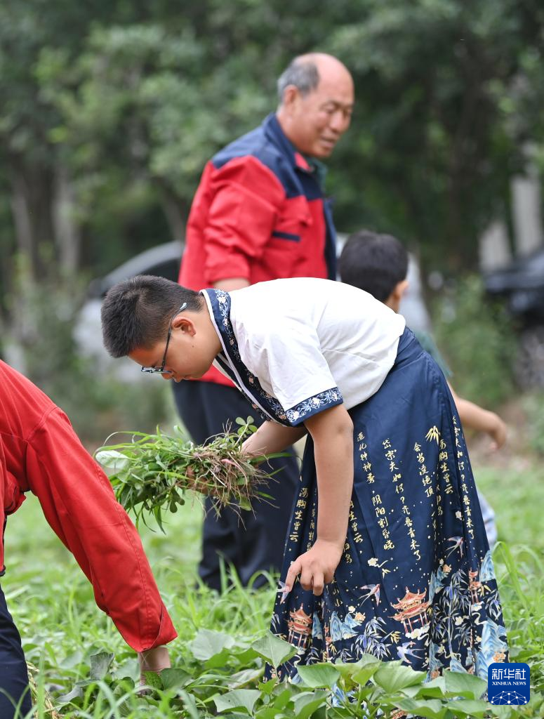 在天津市西青区杨柳青镇的汇爱农庄,家长带着孩子清理杂草(5月31日摄)。