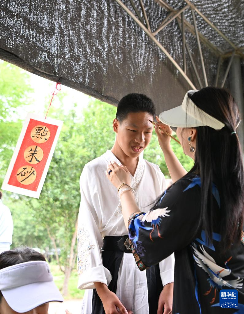 在天津市西青区杨柳青镇的汇爱农庄,前来参加端午活动的志愿者给孩子点朱砂(5月31日摄)。