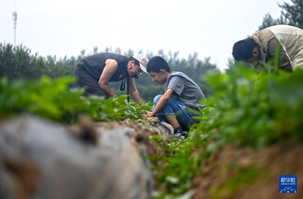 在天津市西青区杨柳青镇的汇爱农庄,农庄负责人(右三)组织孩子和家长一起体验农事活动(5月31日摄)。