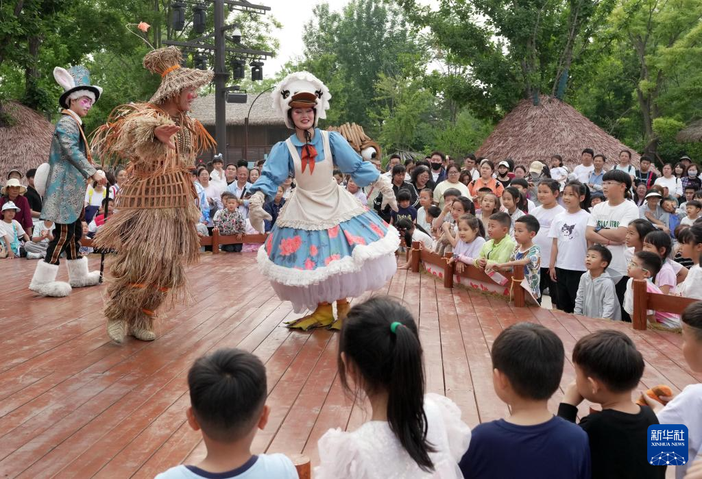 5月31日,河北省秦皇岛市北戴河新区渔田七里海度假区的演员在为游客表演节目《稻草人和他的朋友们》。