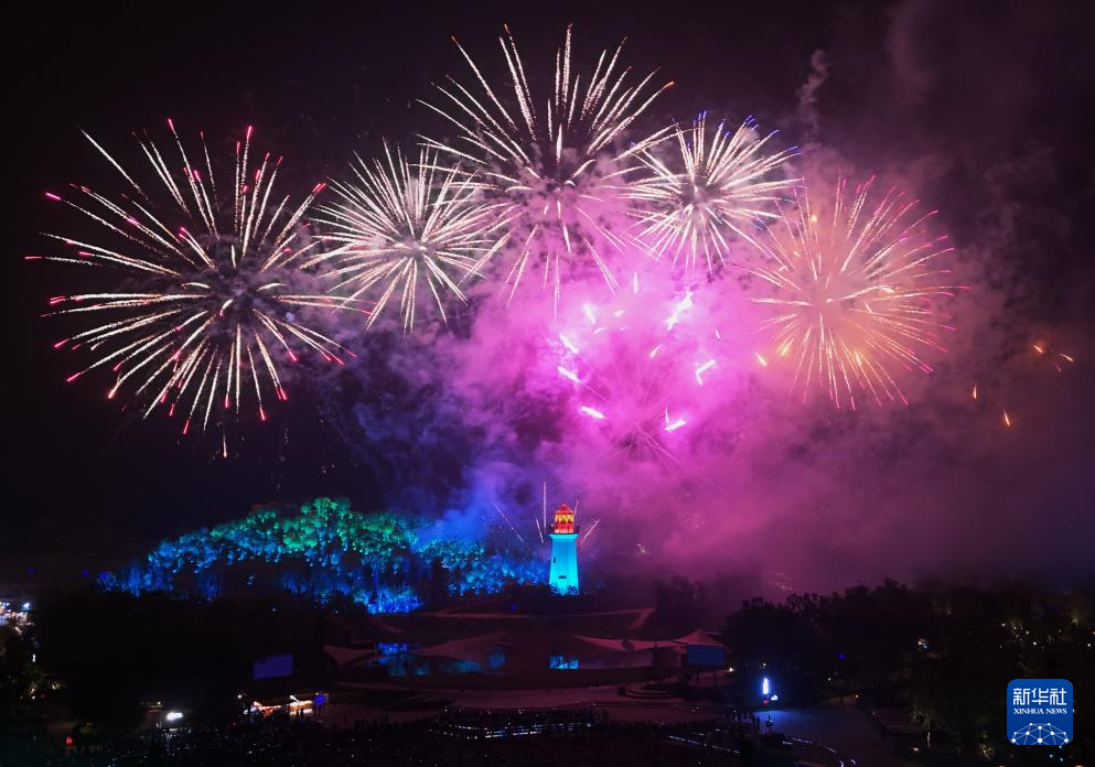 5月31日拍摄的河北省秦皇岛市北戴河新区渔田七里海度假区的烟花秀(无人机照片)。
