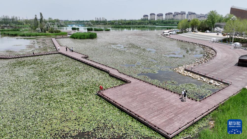 6月1日,游客在位于宁夏银川市的中国花卉博览园观赏睡莲(无人机照片)。