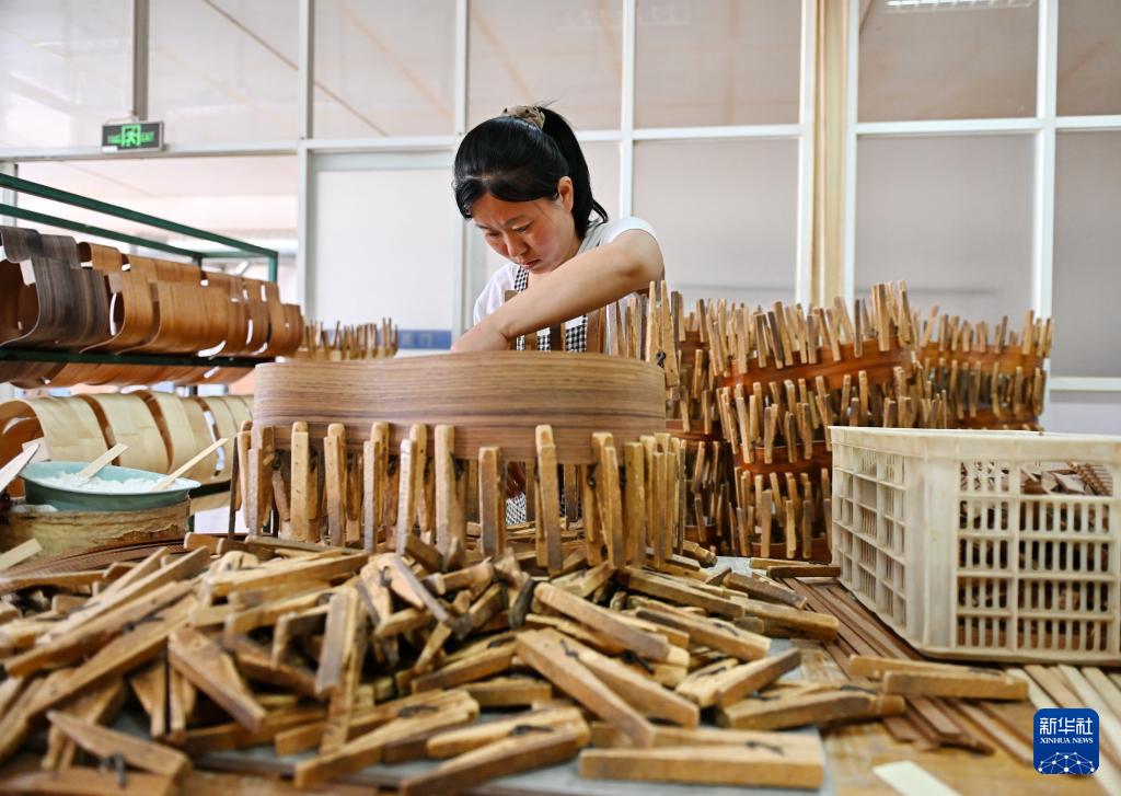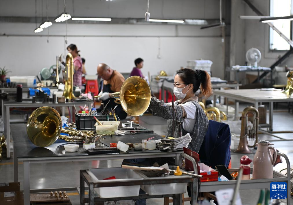 5月28日,河北省武强县一家乐器生产企业的工人在组装乐器。