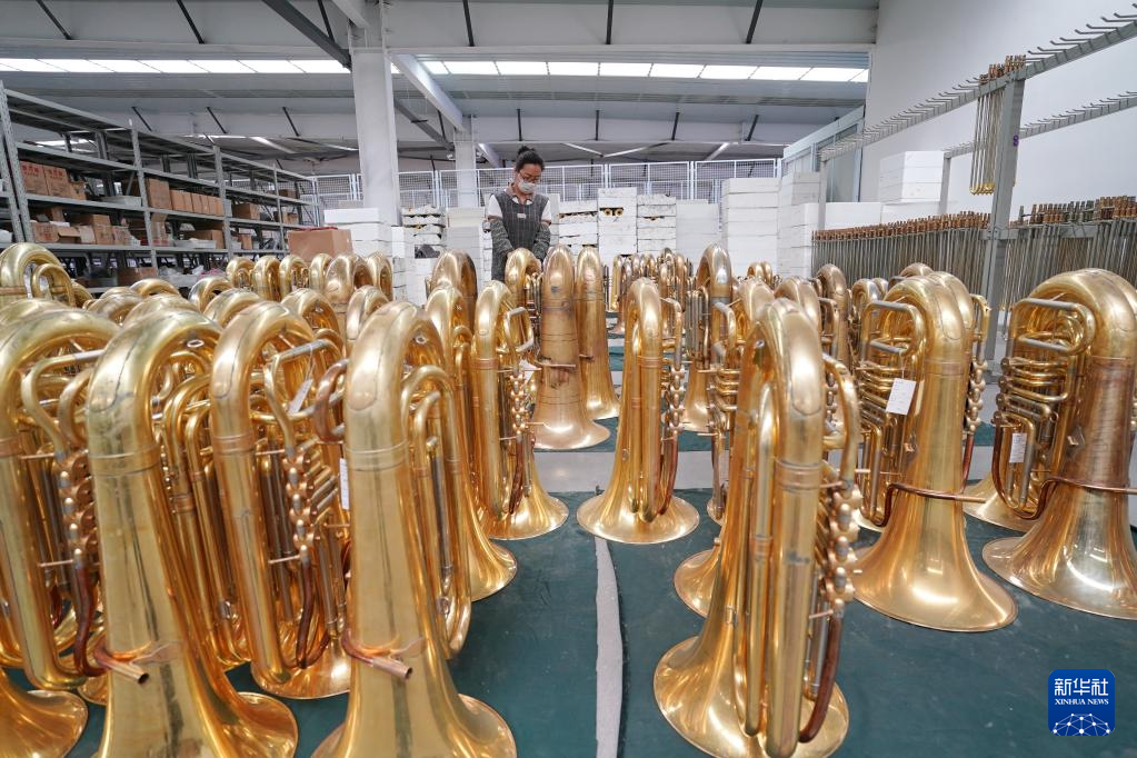 5月28日,河北省武强县一家乐器生产企业的工人在检查乐器质量。
