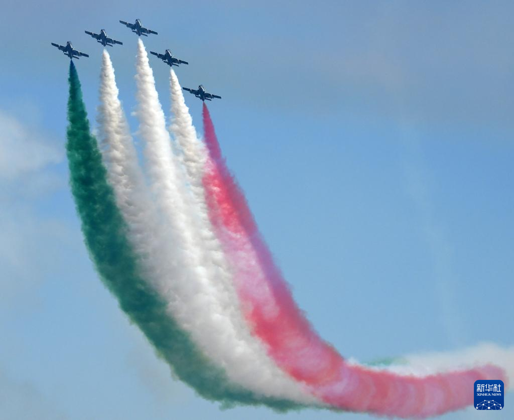 当日,意大利“三色箭”飞行表演队在意大利罗马附近的拉迪斯波利举行的航展上表演。