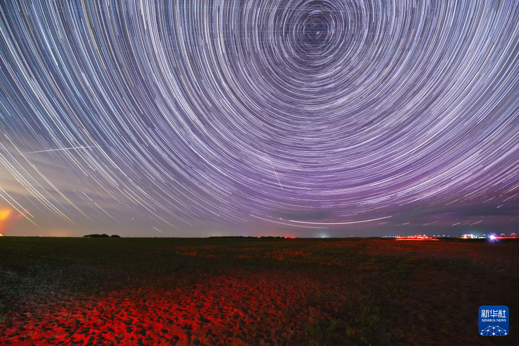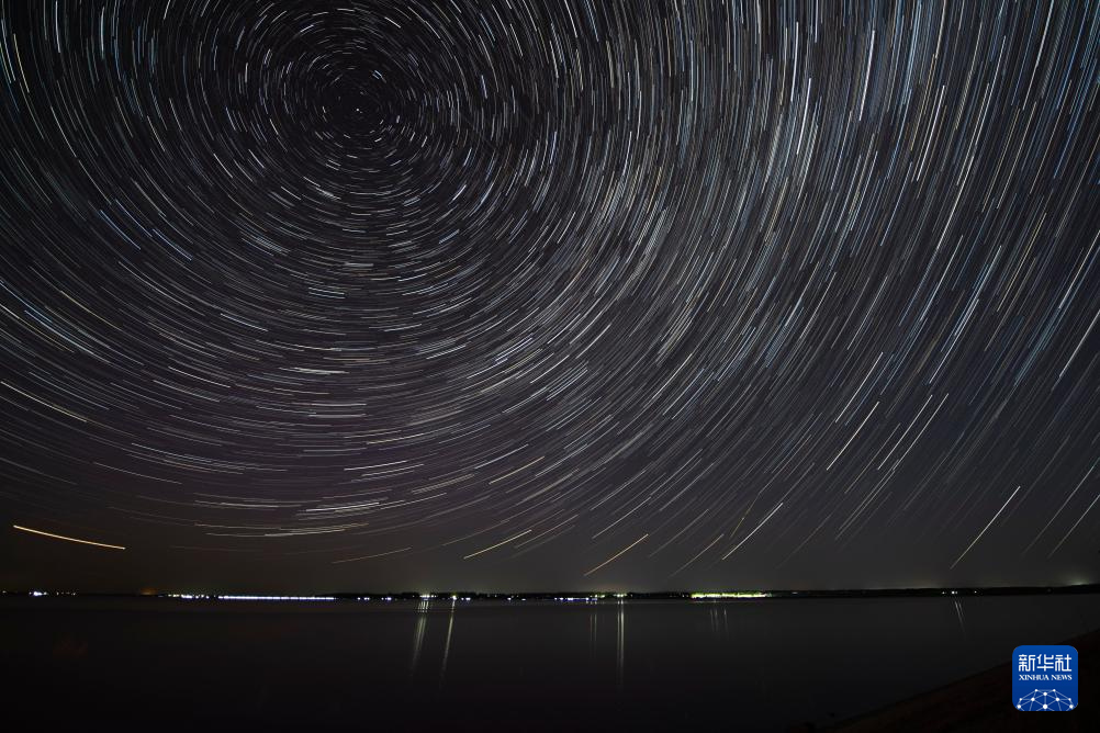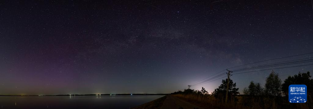 6月1日夜,黑龙江省望奎县卫星水库上空的星空(堆栈合成照片)。