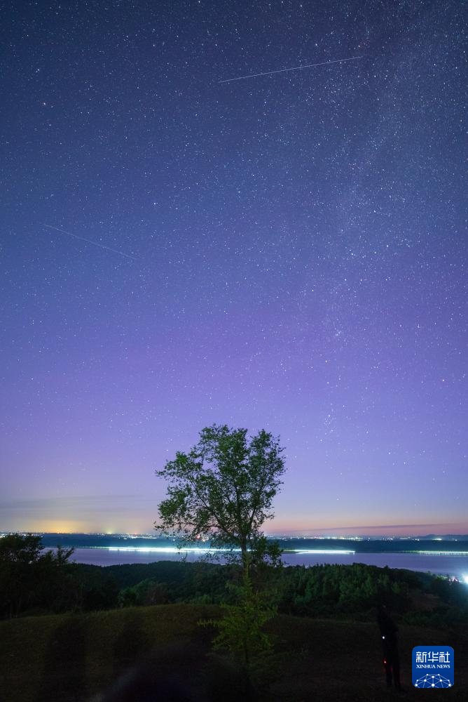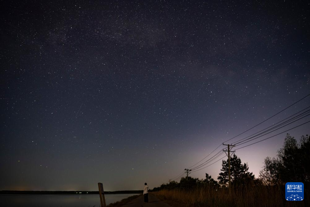 6月1日夜,在黑龙江省望奎县卫星水库旁,观星爱好者仰望星空(长时间曝光照片)。