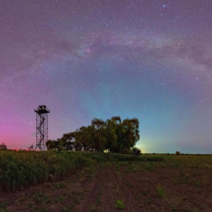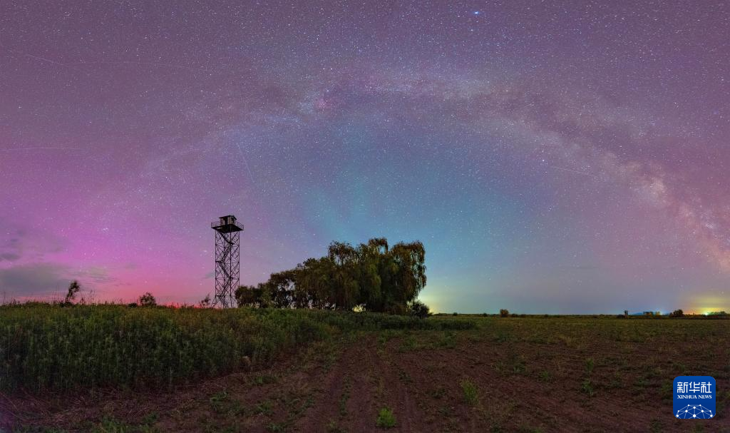 6月1日在黑龙江省佳木斯市富锦市拍摄的极光和银河拱桥(拼接照片)。