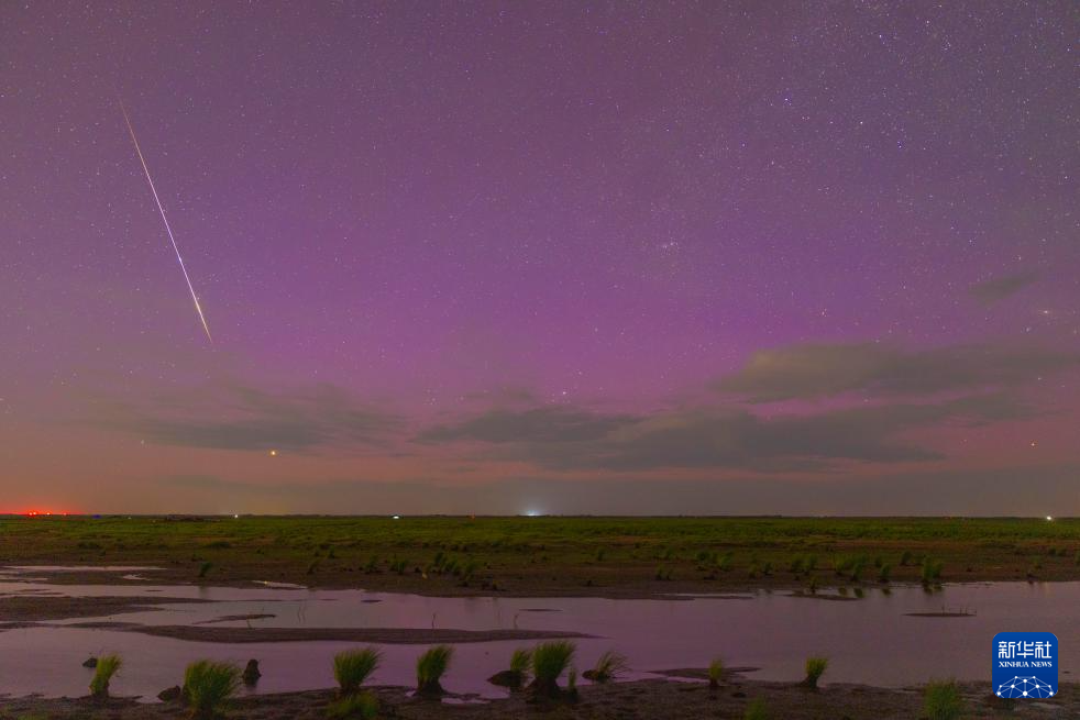 6月1日在黑龙江省双鸭山市集贤县拍摄的极光和流星。